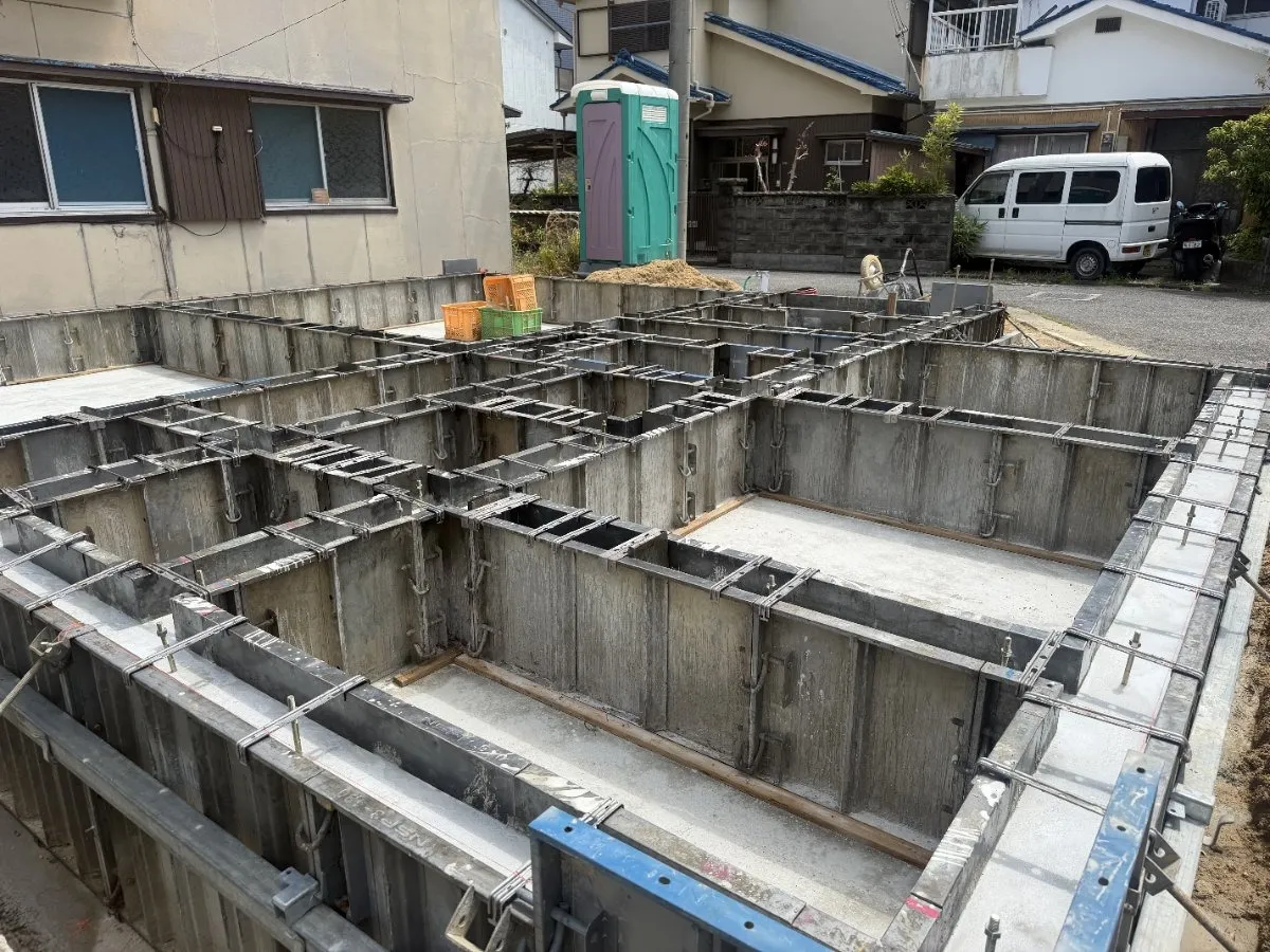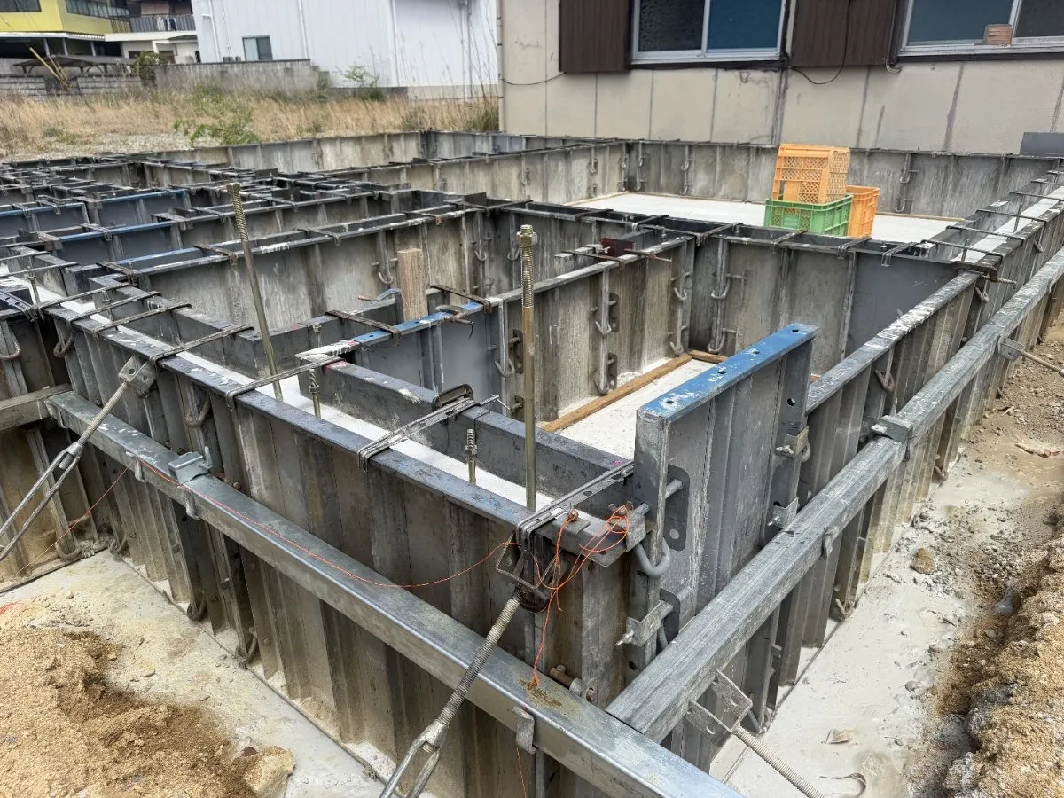 この型枠は、コンクリートが固まるまでの間、所定の形状を保つための「型」となるものです。職人さんたちは、コンクリートが均一に充填されるよう、細心の注意を払いながら作業を進めていました。