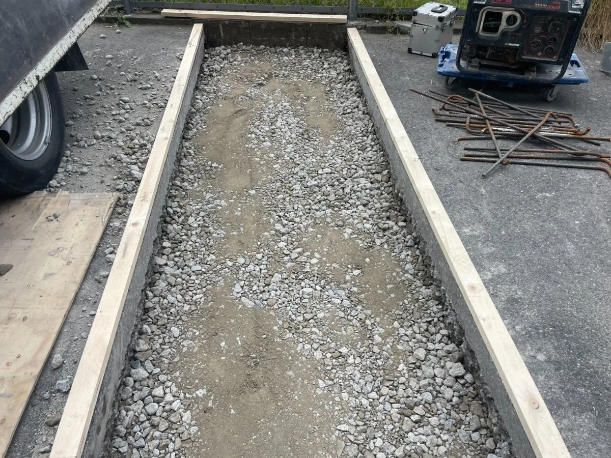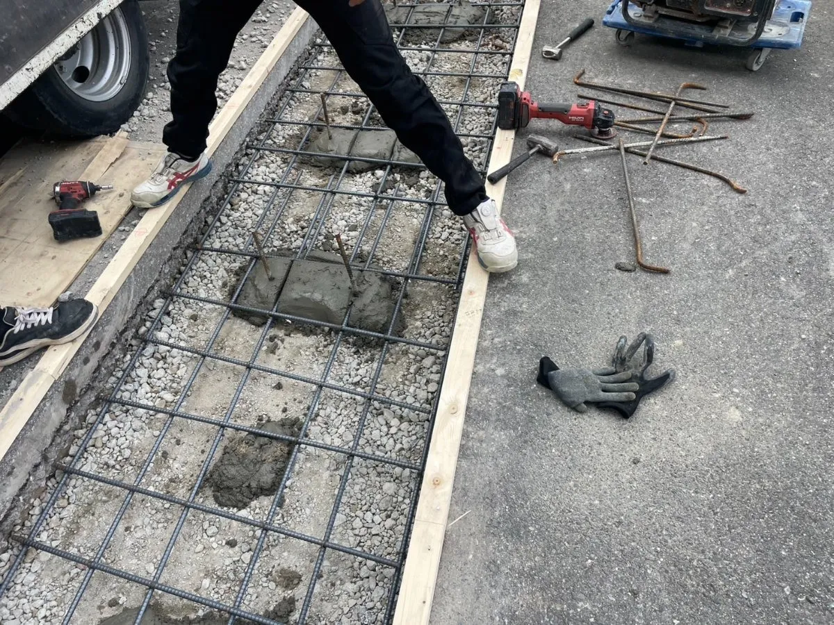 次に、コンクリートを打設するための下準備を行います。撤去した舗装部分の地盤をしっかりと整え、必要に応じて砕石などを敷き均し、転圧をかけます。