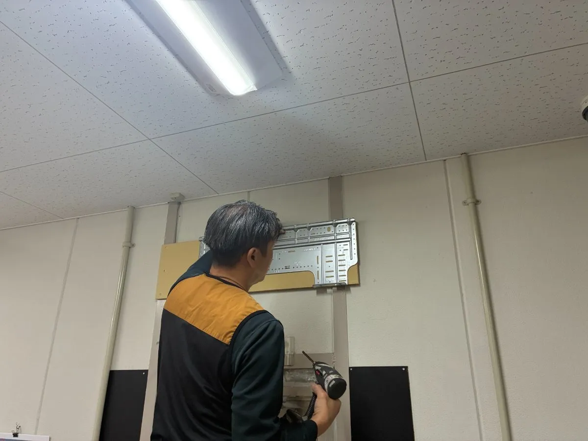現場では、まず室内機を設置する場所を決定し、壁に専用の配管穴を開けます。
